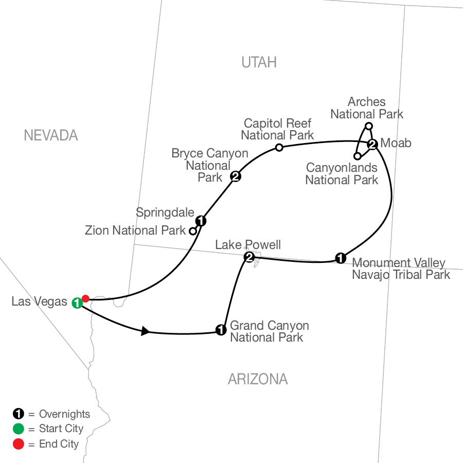 Your Southwest adventure begins beneath the neon lights of Las Vegas before leading to the dramatic red-rock landscapes of six national parks across Arizona and Utah: Grand Canyon, Arches, Canyonlands, Capitol Reef, Bryce Canyon, and Zion. Explore the Navajo Nation with a 4-wheel-drive tour through the iconic scenery of Monument Valley and travel through the remarkable Zion–Mount Carmel Tunnel. Enjoy backcountry barbecues and stays in rustic lodges and scenic resorts, all near some of the nation’s most breathtaking views. PLUS, your tour includes your choice of excursions in Moab so you can plan your day your way.